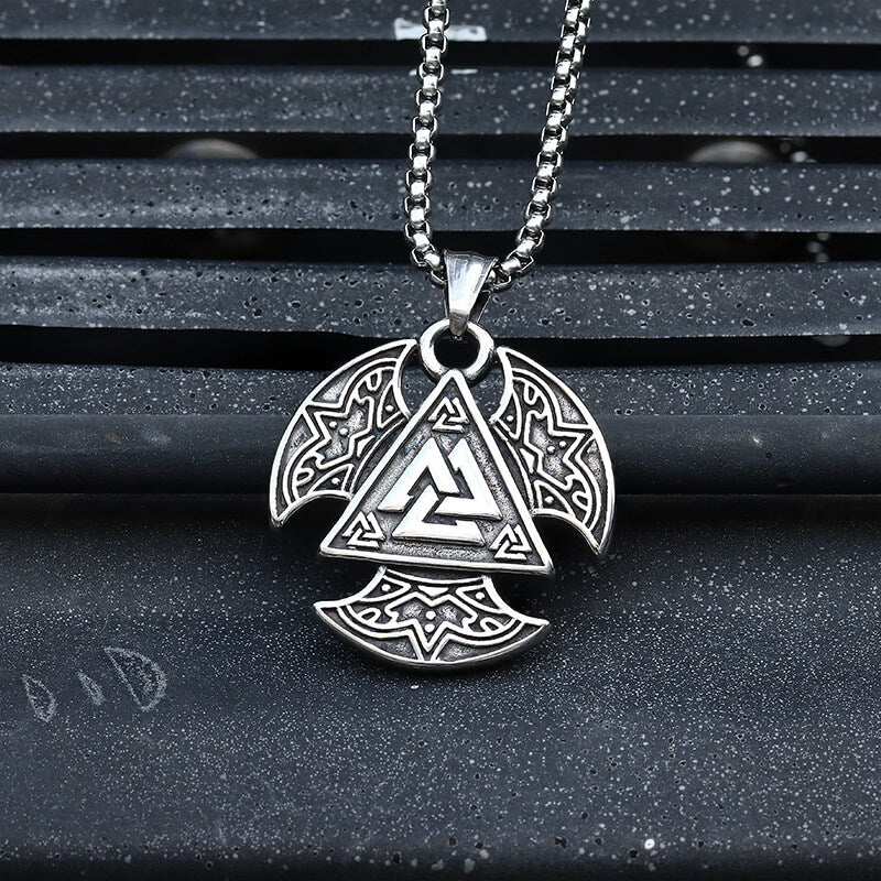 The symbol consisting of three interlocked triangles is called Valknut. The nine corners of three interlocking triangles of the Valknut are associated with the Nine Worlds in Norse mythology. Additionally, the Valknut is usually depicted with ravens and wolves, all of which invokes the connection with Odin. The sun and moon symbolize day and night. This Viking Valknut Necklace is nothing less than a supreme symbol of Odin and of great values that its wearers are seeking in life.